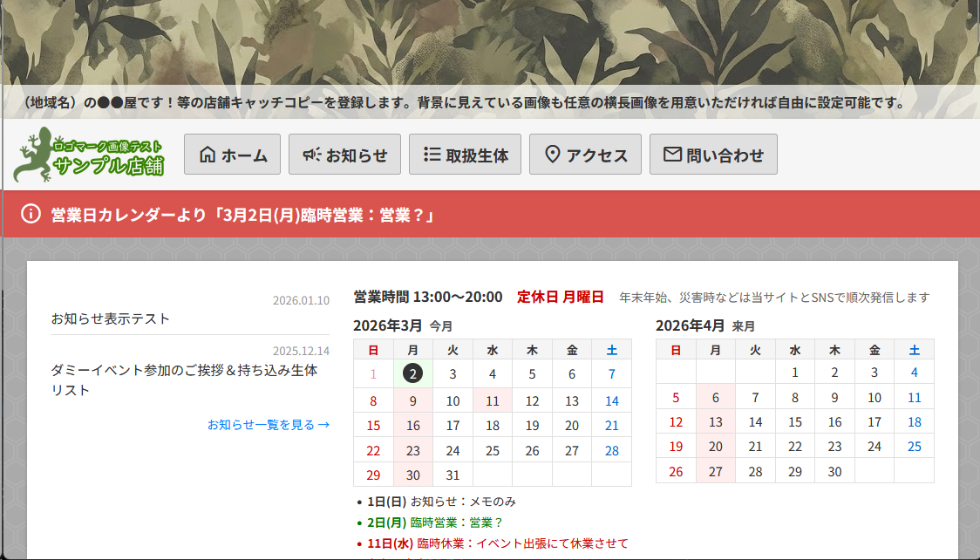 登録内容を元にWebサイトを自動作成!登録した生体データやお知らせを公開する他、店舗案内や営業日カレンダーも!非公開設定やパスワード設定による限定公開も可能です。